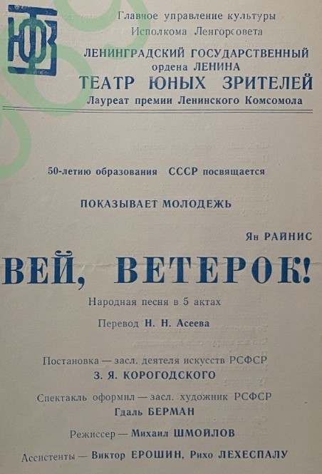 «Вей, ветерок !» (латыш.: Pūt, vējiņi) - Пьеса (народная песня в 5 актах) / Перевод на русский - Николай Н. Асеев (Вей, ветерок !)